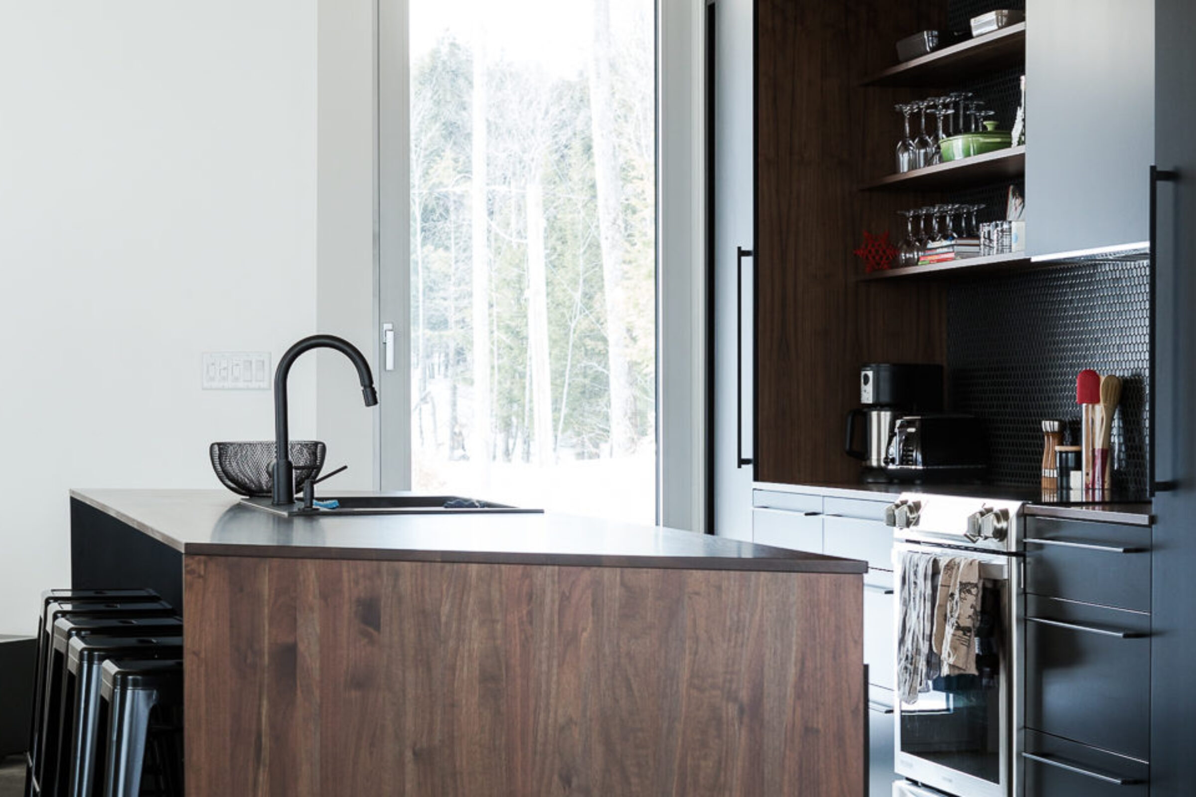Cette résidence secondaire avant-gardiste déborde d’espaces fluides à aires ouvertes. Des stores qui répondent au style de vie du propriétaire ont été installés créant des scènes d’obscurité et d’intimité. L’encastrement des stores à même la structure du bâtiment produit un effet visuel des plus intéressants laissant toute la place à la nature.