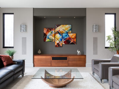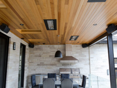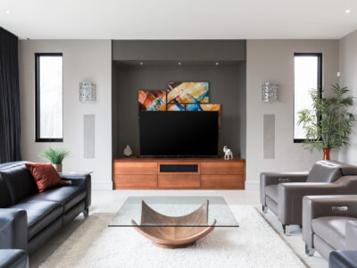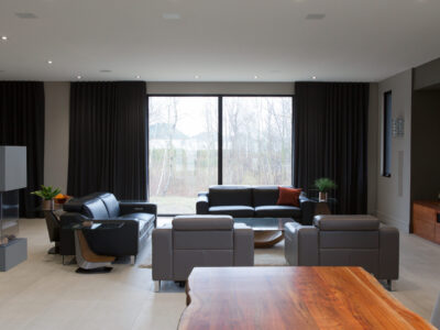 This house has a distinct character with a splendid mix of modern and contemporary elements. An indoor sound system has been installed in the ceilings, and thanks to the ingenious design, the concealed speakers are perfectly positioned for optimal performance. The lighting controls add an undeniable charm and make it possible to customize the rooms according to predetermined settings. The perfect combination of luxury and technology!