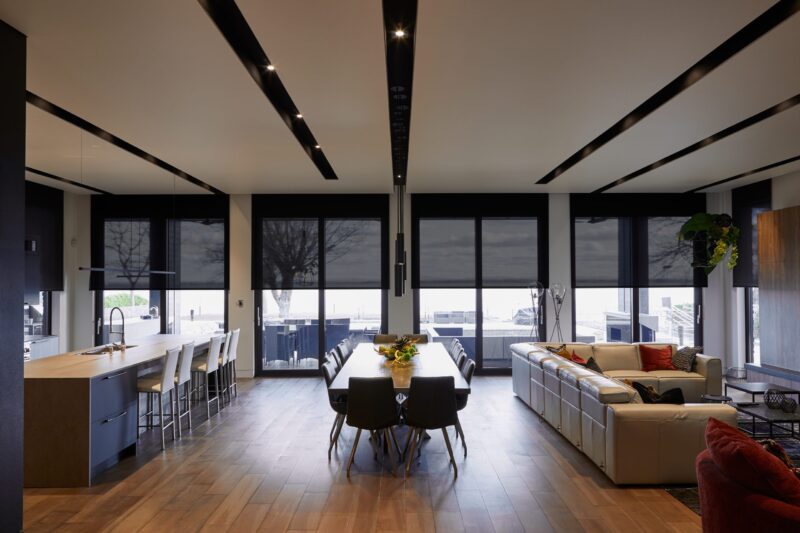 This home has majestic windows and the massive amount of light that comes in can create glare sometimes. Thanks to the motorized shades, the homeowners can get the perfect lighting throughout the day. The shades also help to reach the perfect temperature and reduce energy consumption associated with cooling and heating.