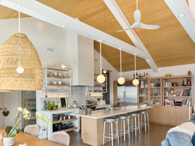 The main living area has been enhanced with Sonance speakers featuring Discrete Openings System, discreetly integrated into the decorative beams. This setup delivers a rich and immersive sound experience while maintaining the clean and minimalist interior design.