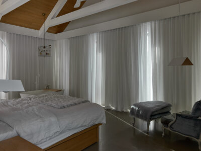In the master bedroom, motorized Lutron shades provide unparalleled comfort, allowing control of natural light in this beautifully windowed space.